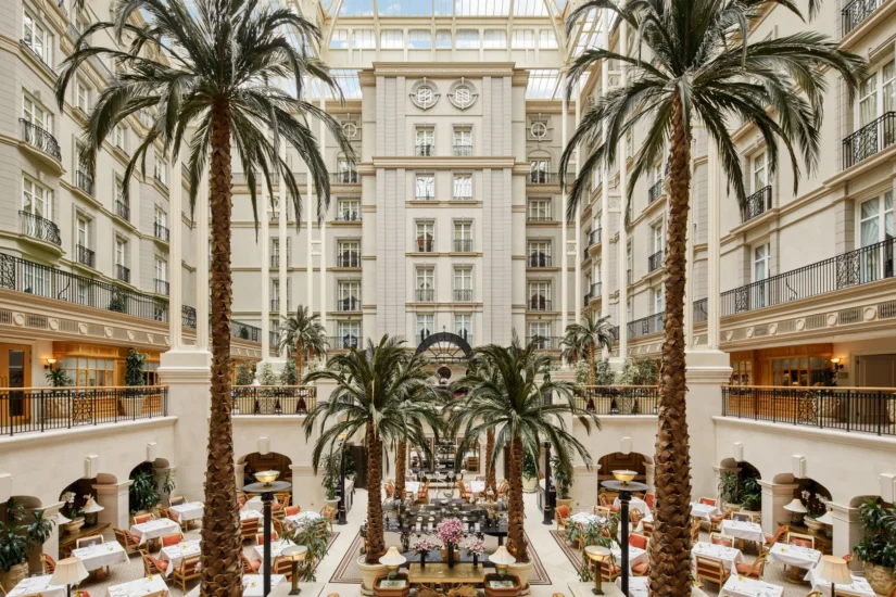 - Високи палми, мраморни подове и сводест стъклен покрив придават на атриума почти тропическа или подобна на градина атмосфера, осигурявайки запомнящ се фон за хранене и социални събирания.