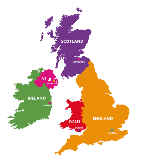 • Шотландия: Намира се в северната част на Англия, известна със своите различни културни и правни системи, със столица Единбург (Edinburgh).